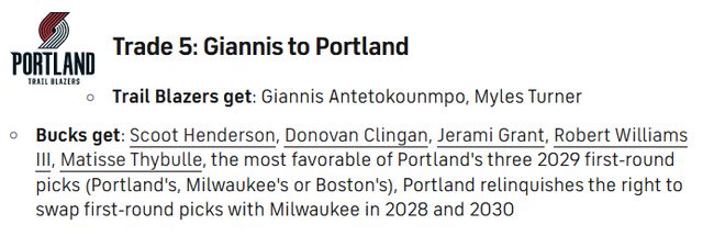 這筆6換2的具體方案是開拓者得到字母哥和特納,送出亨德森、克林根、格蘭特、羅威、塞布爾、開拓者所持三個2029年首輪簽中順位最優(yōu)的簽位(開拓者、雄鹿和凱爾特人),同時開拓者放棄2028年和2030年與雄鹿的首輪簽互換權(quán)。